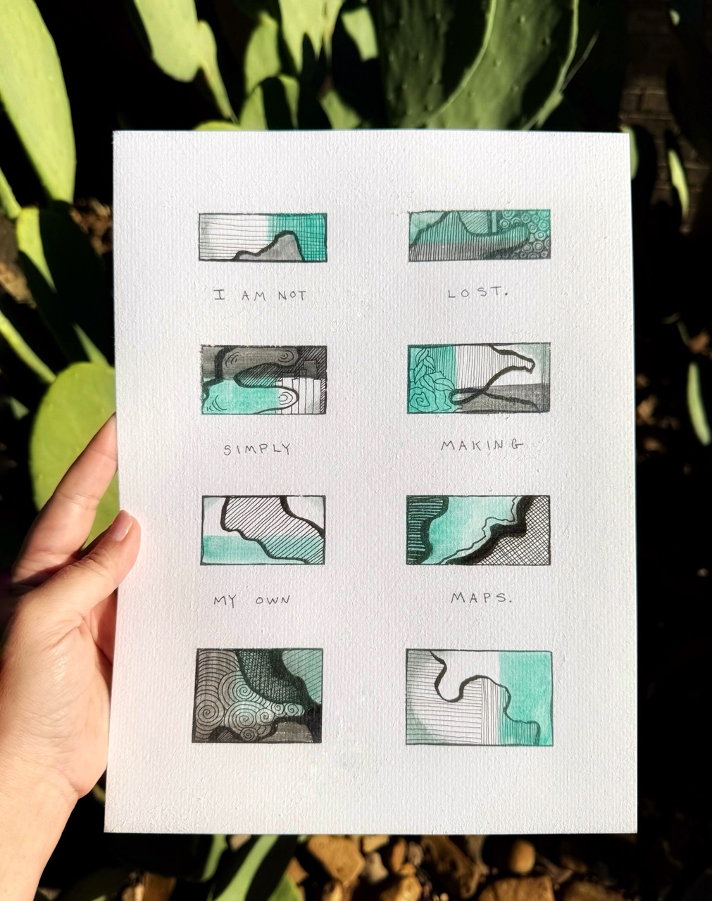 I went outdoors to take an image of it and my neighbor walked by and stated, “Oh that’s so fairly. ‘I AM NOT SIMPLY MY OWN. LOST. MAKING MAPS,’” and I used to be like, “Welp. Shut sufficient, I suppose.”