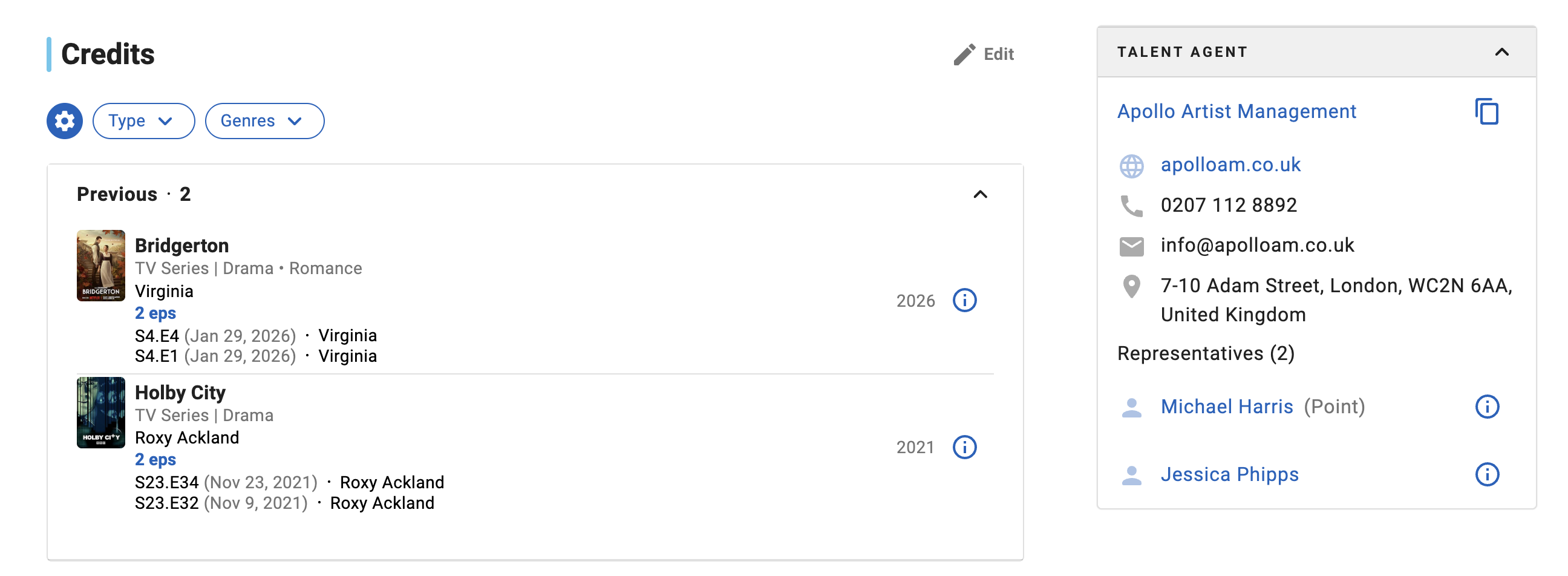 Then, I can have a look at their agent data and add these particulars to my checklist for additional analysis. This can be a nice method to discover companies whose shoppers are already reserving work, and have these relationships with the Casting Administrators engaged on my goal productions.