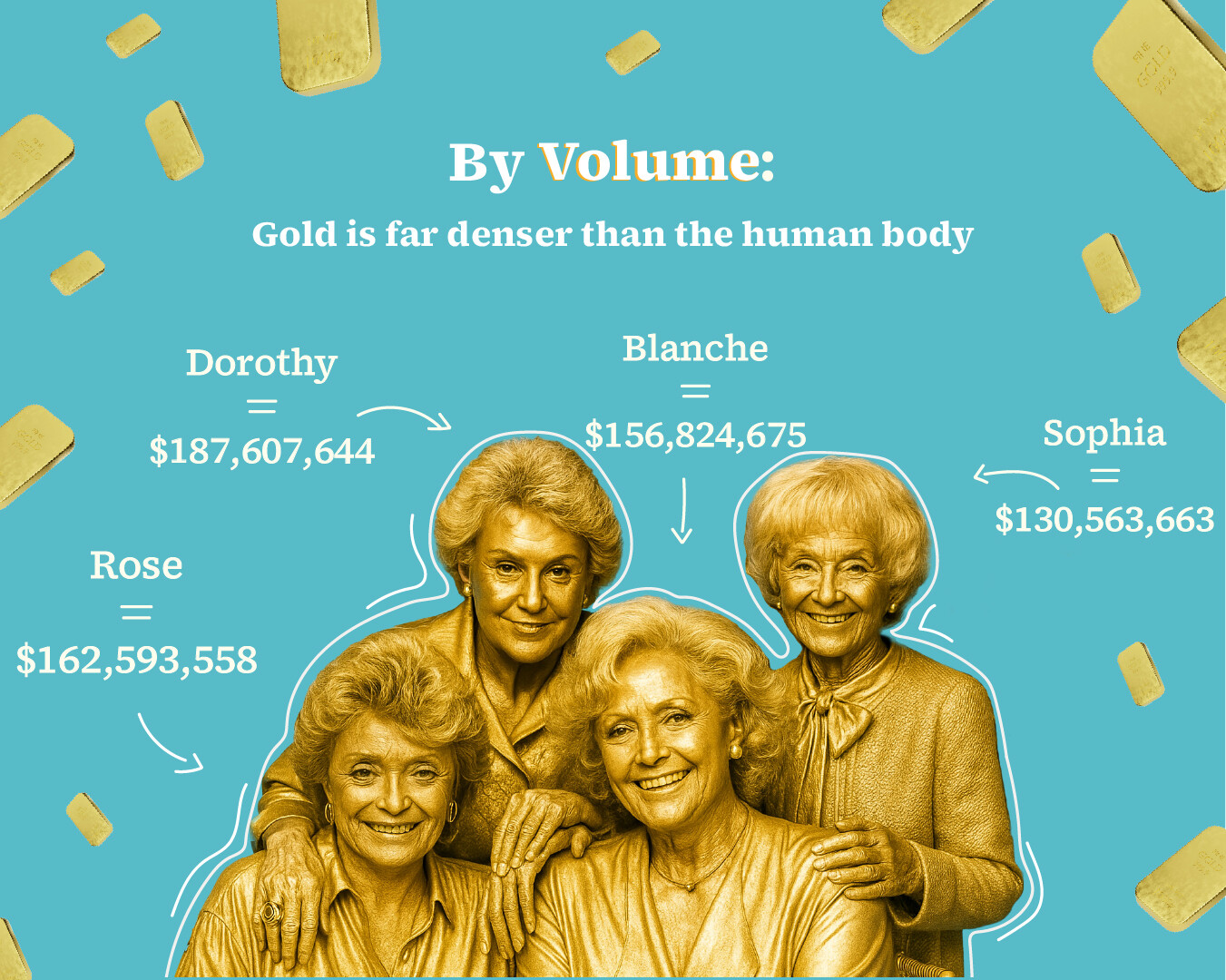 Over seven seasons, The Golden Women explored loads of life’s huge questions—like why cheesecake is the final word cure-all and why friendship issues most. However it by no means tackled the query in plain sight: Simply how a lot would Rose, Dorothy, Blanche and Sophia be price in the event that they had been really manufactured from gold?