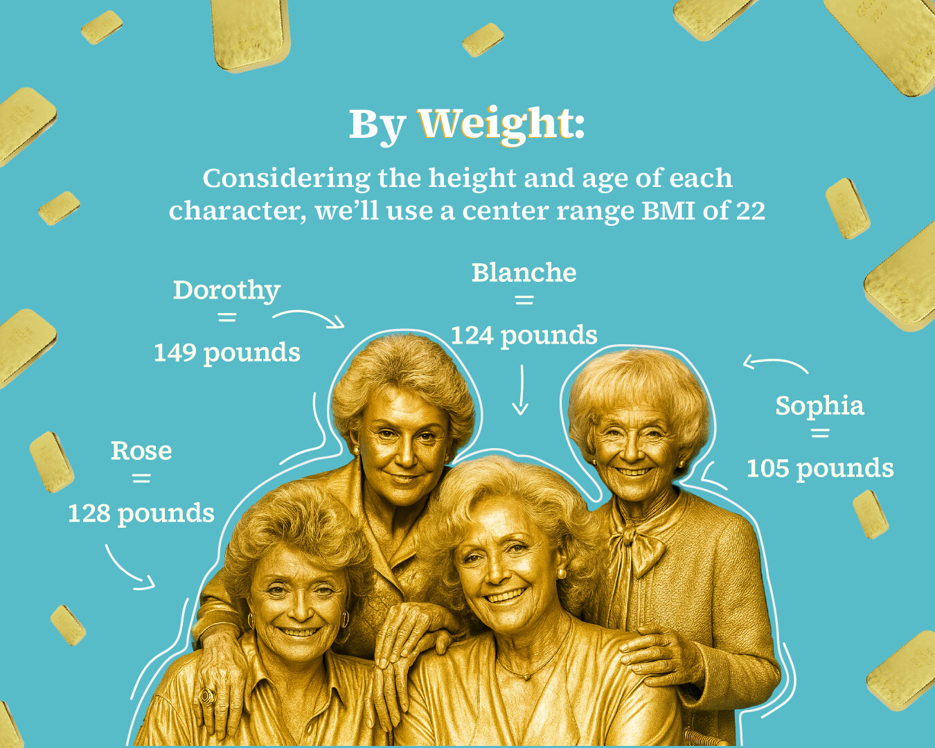 That mentioned, the load calculation is straightforward, you begin with the load of every of the Golden Women, then convert that to the present worth of a pound of gold. Contemplating the peak and age of every character, Hind says, for those who use a middle vary BMI of twenty-two, their weights are as follows: Dorothy is 149 kilos, Rose is 128 kilos, Blanche is 124 kilos and Sophia could be 105 kilos.Whereas one may quibble over the actresses’ actual measurements, Hind steered preserving issues easy. Utilizing the identical BMI figures for every girl, he defined, helps easy out the variations—and spares us the awkward process of calculating anybody’s weight, particularly that of 4 dearly departed icons.